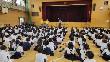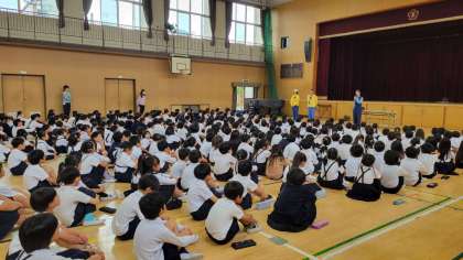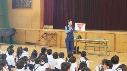 東住吉警察署の交通安全課のお巡りさんと東住吉区役所よりラビット隊の方に来て頂き、交通安全についてのお話を聞きました。