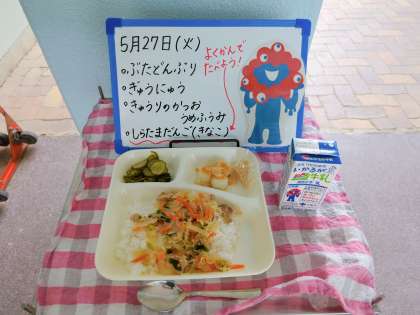 今日の給食は、豚丼、牛乳、きゅうりのかつお梅風味、白玉だんご(きなこ)です。