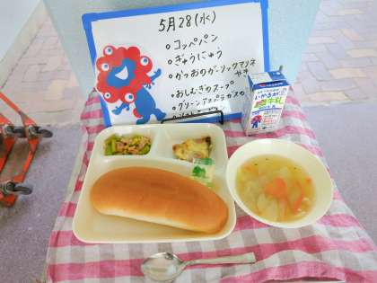 今日の給食は、コッペパン、牛乳、かつおのガーリックマリネ焼き、押し麦のスープ、グリーンアスパラガスのソテーです。