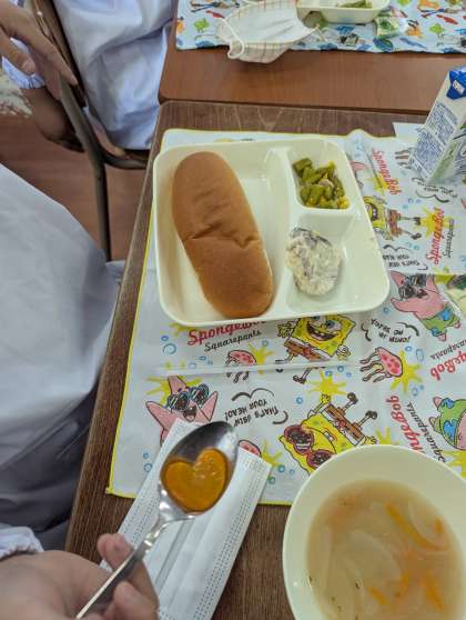 今日の給食には、旬の生のグリーンアスパラガスをコーンと一緒にいため、塩とこしょうで味付けしました。教室では、「グリーンアスパラガス苦手だけど今日のアスパラは好き!(2年生)」「かつおおいしい!おかわりした!(2年生)」「押し麦がもちもちしておいしい(1年生)」「ラッキーにんじん入っていた(1年生)(2年生)」と児童に好評でした。