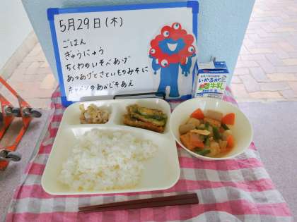 今日の給食は、ごはん、牛乳、ちくわのいそべあげ、厚揚げと里芋のみそ煮、キャベツの赤じそあえです。