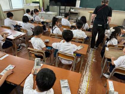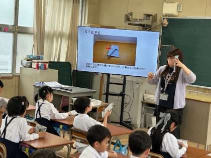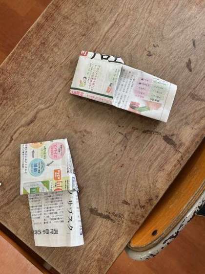 1年生は、教室で新聞紙を使って簡単なスリッパを作りました。