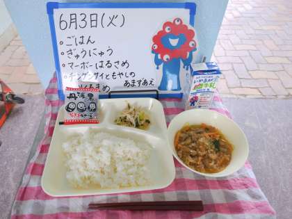 今日の給食は、ごはん、牛乳、マーボー春雨、チンゲンサイともやしの甘酢和え、いり黒豆でした。