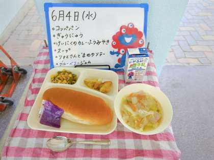今日の給食は、コッペパン、牛乳、鶏肉とカレー風味焼き、スープ、ツナと三度豆のソテー、ブルーベリージャムです。
