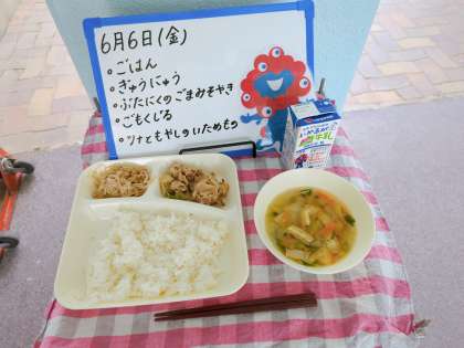 今日の給食は、ごはん、牛乳、豚肉のごまみそ焼き、五目汁、ツナともやしのいためものです。