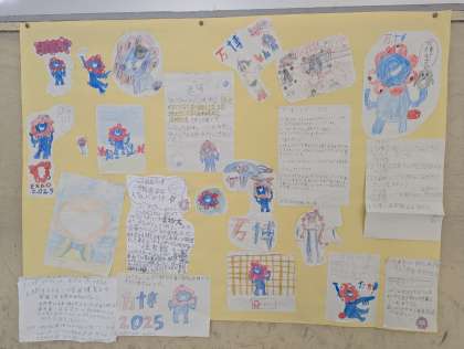 昨日は雨で万博が中止になりましたが、子ども達は万博の事を調べたり、壁新聞を作ったりしました。