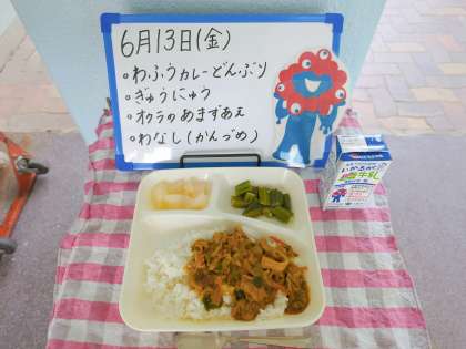 今日の給食は、和風カレー丼、牛乳、オクラの甘酢和え、和なし(缶)です。