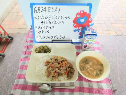 給食は、豚ひき肉とにらのそぼろ丼、牛乳、みそ汁、きゅうりのゆず風味です。