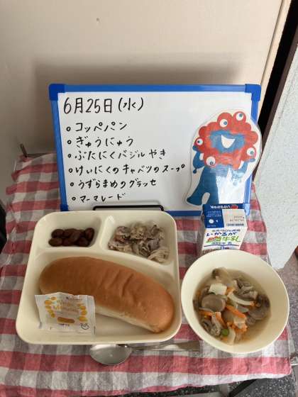 給食は、コッペパン、牛乳、豚肉のバジル焼き、鶏肉とキャベツのスープ、うずら豆のグラッセ、マーマレードです。