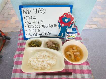 今日の給食は、ごはん、牛乳、豚肉の梅風味焼き、五目汁、三度豆のごまあえです。