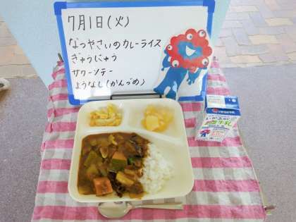 なすやトマト、かぼちゃ、ピーマン等、いつもとは違う野菜がカレーに使われていました。プールがある屋上までカレーの香りが漂っていたようで、プールの時間から今日のカレーライスを楽しみにしている児童がいました。