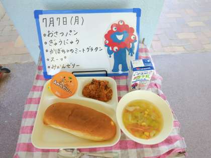 今日の給食は、おさつパン、牛乳、かぼちゃのミートグラタン、スープ、みかんゼリーです。