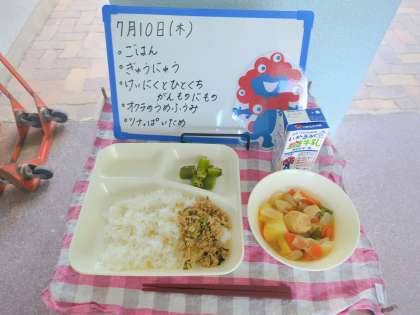 今日の給食は、ごはん、牛乳、鶏肉と一口がんもの煮物、オクラの梅風味、ツナっ葉いためです。