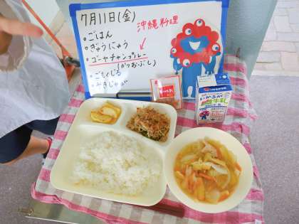 今日の給食は、ビタミンCが多いゴーヤ(にがうり)を使ったゴーヤチャンプルーです。