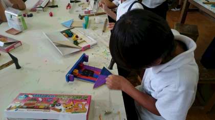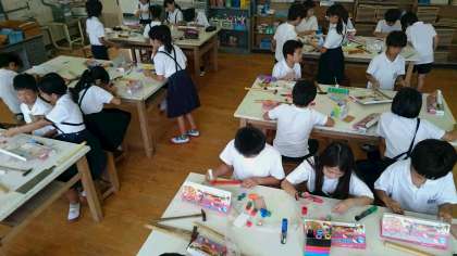 図画工作科では、のこぎりで木を切って、組み合わせていろいろなものを作っています。みんな集中しながら真剣に取り組んでいます。
