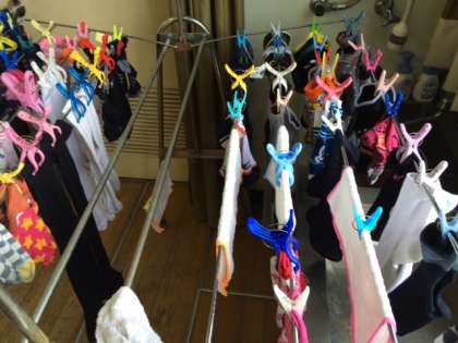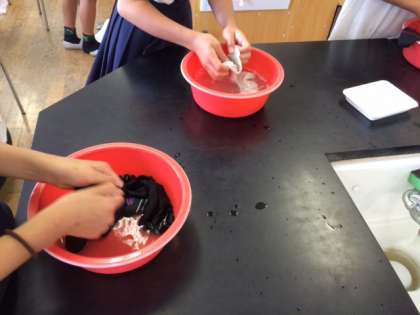 洗濯桶を使って、ふり洗い、おし洗い、もみ洗い、つまみ洗いと進めていきます。