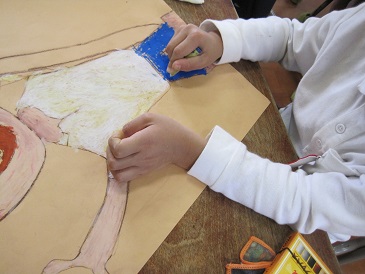 1年生は作品展に向けて、運動会の玉入れの絵を描いてます。