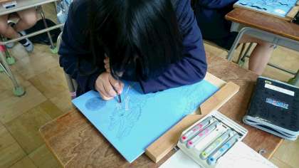 4年生から、彫刻刀を使って木版画の作品を作ります。
