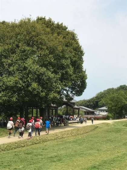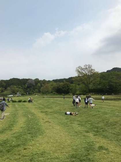 先にゴールしたグループから、芝生でくつろいでいます。気持ち良さそう。他の学校も続々とゴールしています。