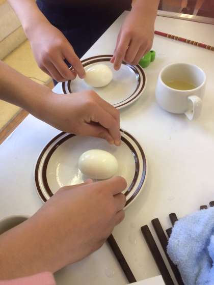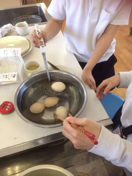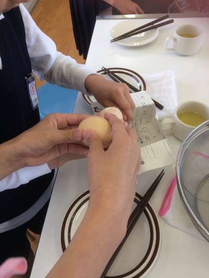 自分で殻をむき、糸で切ったり、ゆで卵切り器を使って切ったりしました。