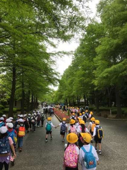 美味しくお弁当をいただき、これから学校へ帰ります。初めての遠足は長い距離を歩きましたが、列を意識しながら、車に気をつけて歩くことができました。