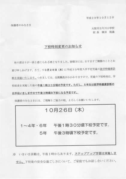 下校時刻変更のお知らせ