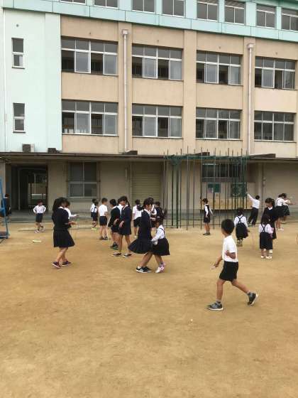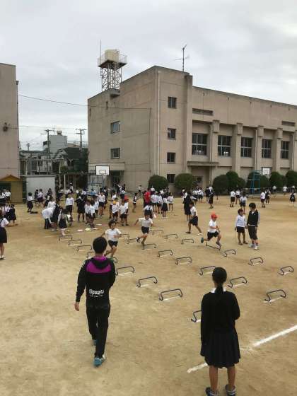 曇り空ではありましたが、おもいっきり体を動かしていました。縄跳びやミニハードル、フラフープといろんな種目にチャレンジしました。高学年の児童が低学年の児童に優しくアドバイスをしている姿は大変素晴らしく、微笑ましい光景でした。