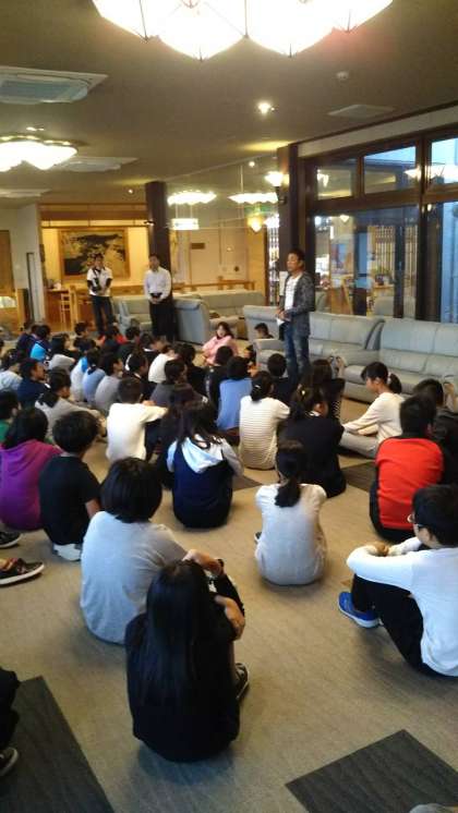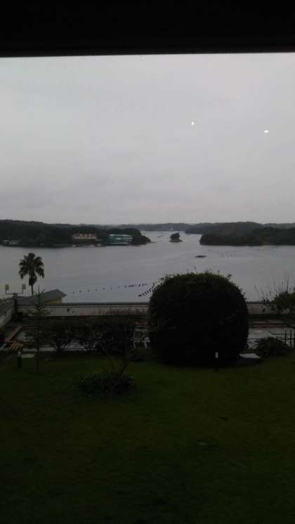 宿舎からの景色です。今日もあいにくの天気です。朝の集いをしています。