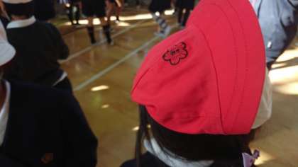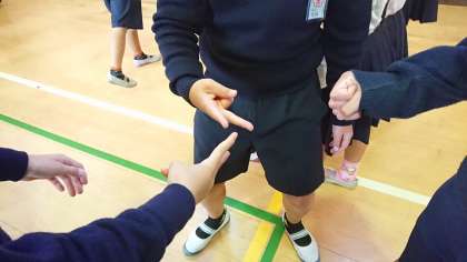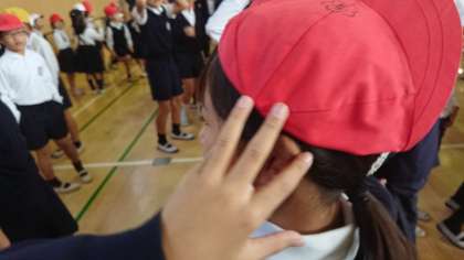 赤白帽子を使って、異学年の人とじゃんけんをします。勝ったら成長していきます。