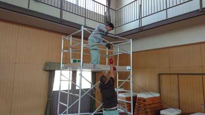 子供たちが描いた絵画作品を、吊るすためのワイヤーを朝から管理作業員が設置をしました。