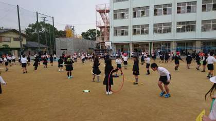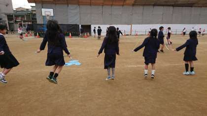 寒さに負けず、子供たちはなわとびやフラフープ、ミニハードルに挑戦し、たくさん体を動かしています。