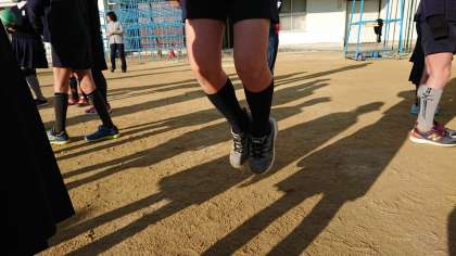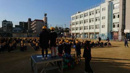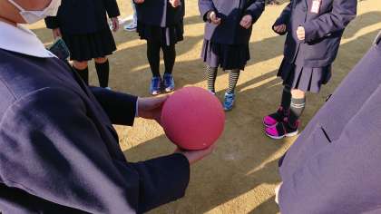 縦割り班でボールを回し、係りの人の「ドン」の掛け声の時にボールを持っているとジャンプ5回をしなければなりません。