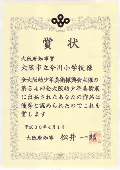 昨年度に出品した今川小学校の図画の絵が優秀と認められて大阪府知事から賞状をいただきました。