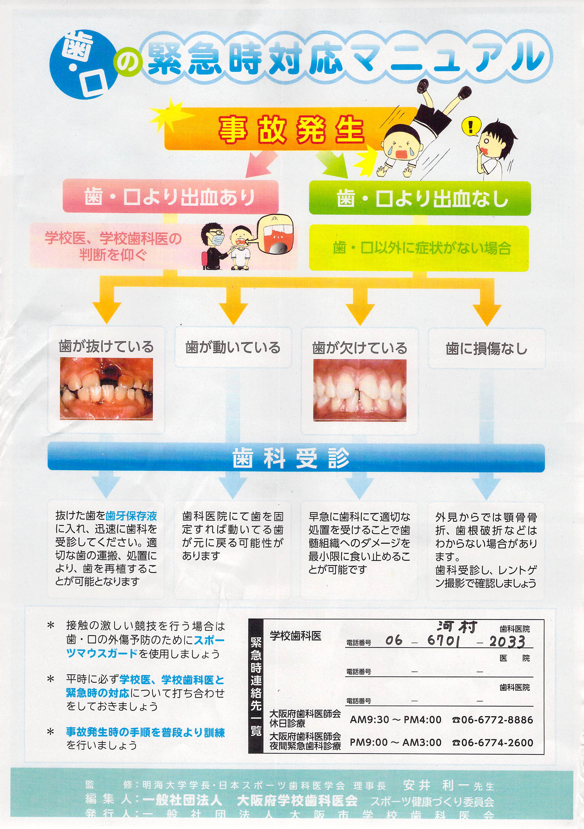 学校歯科医の先生が今年度より河村歯科の河村守隆先生になりました。河村先生より「歯・口の緊急時対応マニュアル」を紹介していただきました。もしものケガの時に参考にしてください。