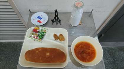 おさつパン、一口トンカツ、ミネストローネ、まめこんぶです。