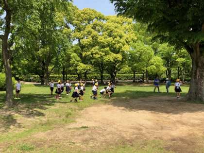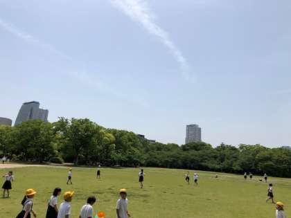 広い芝生で鬼ごっこやだるまさんがころんだなどをして遊びました。今から森ノ宮まで歩きます。