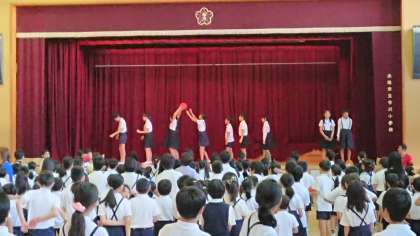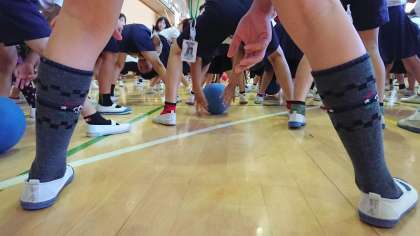 体の上や横、股の下をボールを通します。班で協力して次の人が取りやすいところへ渡していました。