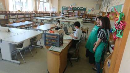 図書館ボランティア及び図書委員会の児童が昼休みに図書の貸し出し、返却をしています。