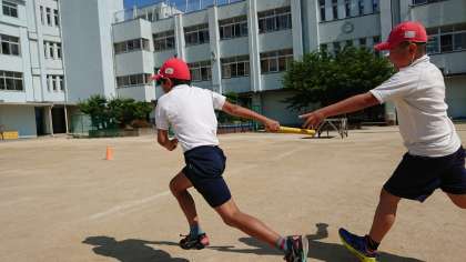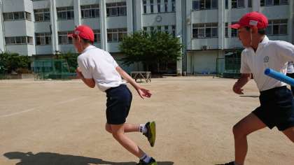 リレーに向けて、バトンワークの練習です。チームで息を合わせながらトップスピードを落とさないように、次のランナーにバトンをつないでいました。1回1回、真剣に取り組む姿は、とても素晴らしいです。
