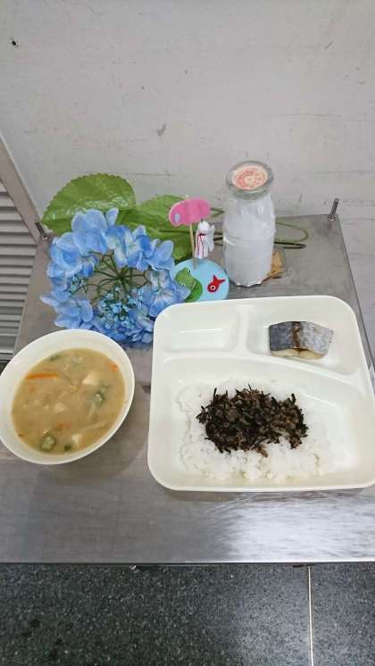 さごしの塩焼き、味噌汁、牛ひじきそぼろ