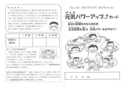 6月4日〜9日の健康週間において、「元気パワーUP」を目的に自分の生活習慣を見直しました。その時に使用したカードを後日持ち帰ります。ご覧になっていただき、お子様の頑張りに対して温かい言葉がけや励ましをお願いします。