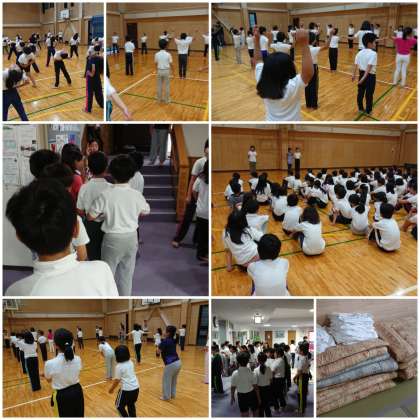 朝のつどいは体育館。全員が揃ってラジオ体操をしました。