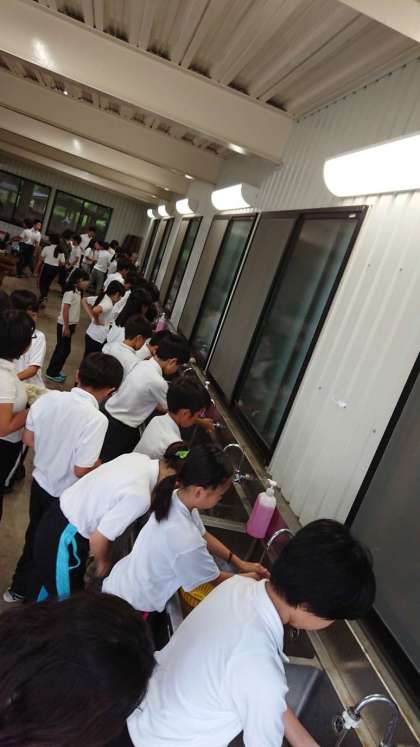 まずは、係りの人の話を聞いてから、手を綺麗にあらい始めます。