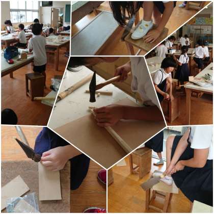 のこぎりを使って木を切り、金づちを使って釘を打ちこみます。それらを組み合わせて、作品を作っています。