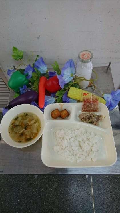 ゴーヤチャンプルー、すまし汁、厚揚げの味噌だれかけ