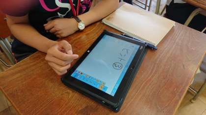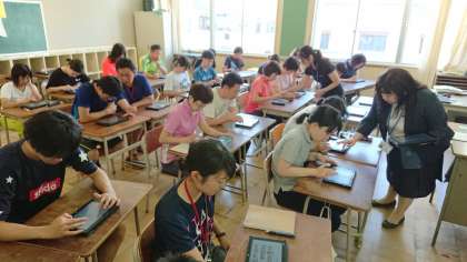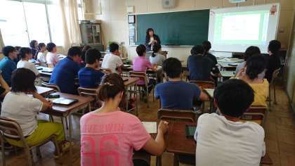 タブレット端末を用いて、学習課題に対する自分の考えやグループの考えを整理し、大型ディスプレイに表示することで、クラス全体で情報を共有するとともに、プレゼンテーションや児童間での活発な意見交換等をする学習ができるような授業を目指し、研修会を行いました。