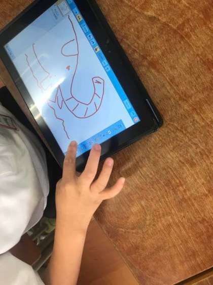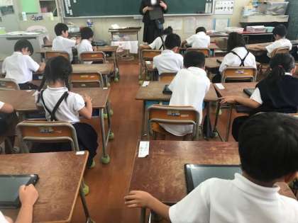 タブレットの電源やパスワードを入れてみたり、アプリをつかって絵を描いたりしました。初めてタブレットを使った児童もおり、楽しみながら取り組んでいる様子でした。