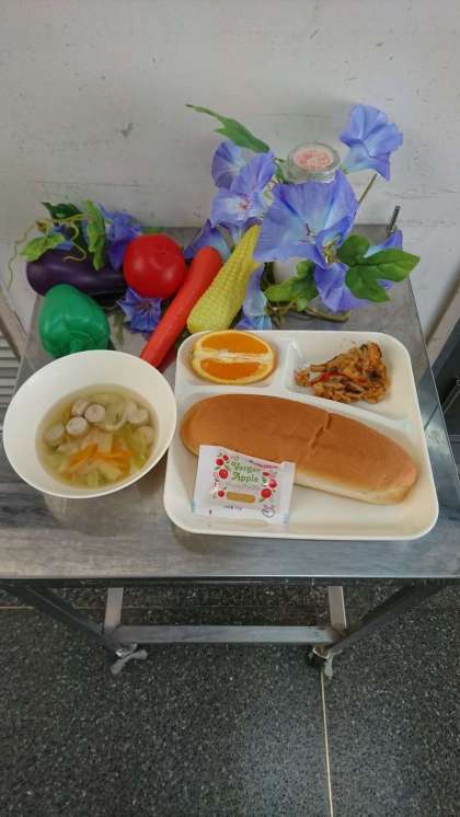 パエリア、ウインナーとキャベツのスープ、オレンジ