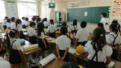 楽しい夏休みも終わり、まだまだ残暑が厳しい中、2学期が始まりました。こどもたちはたくさんの夏休みの課題を持って、元気よく登校してきました。今回の始業式は、熱中症予防のために各教室で行われました。先生から、登下校時には防犯ブザーを忘れずに携帯しておきましょうという話がありました。