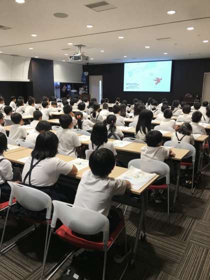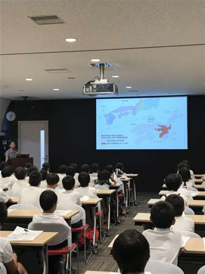 新聞について説明していただきました。みんな、とても真剣な眼差しでスクリーンを見ています。